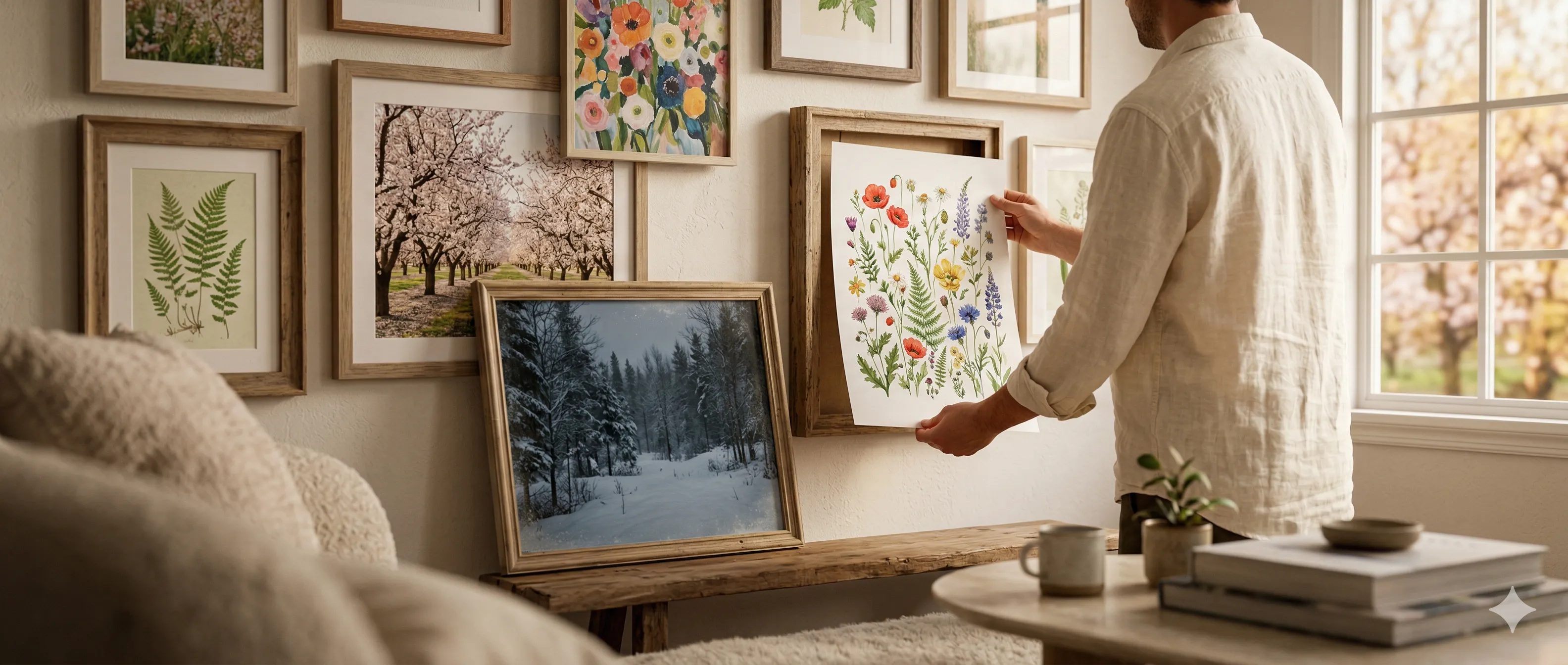 This guide covers how to design a gallery wall built for rotation: standardizing sizes for easy swaps, curating seasonal themes, and keeping your "off-season" prints safe for next year.
