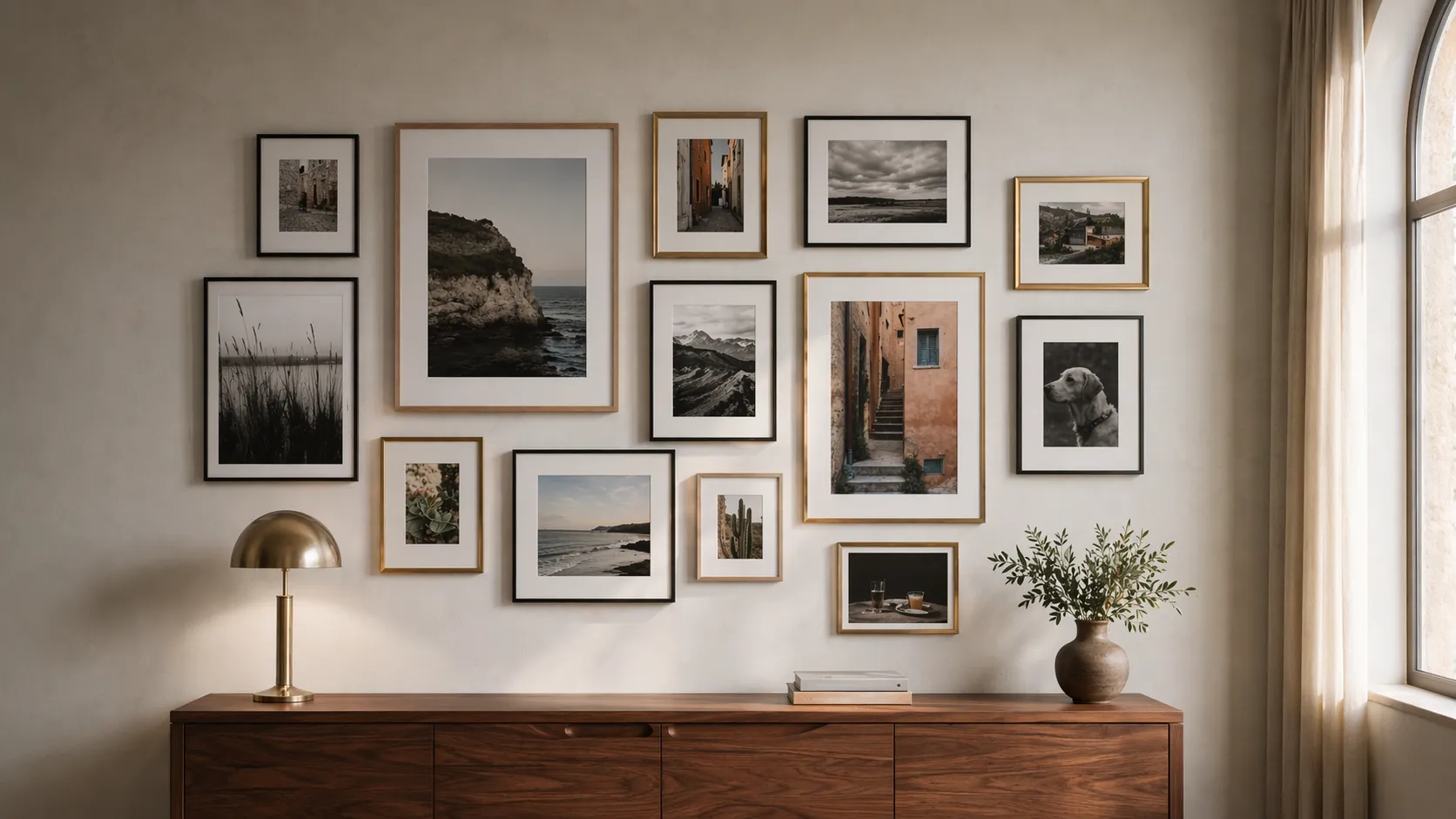 - The wall has 6+ frames. Below that, composition mostly sorts itself out.